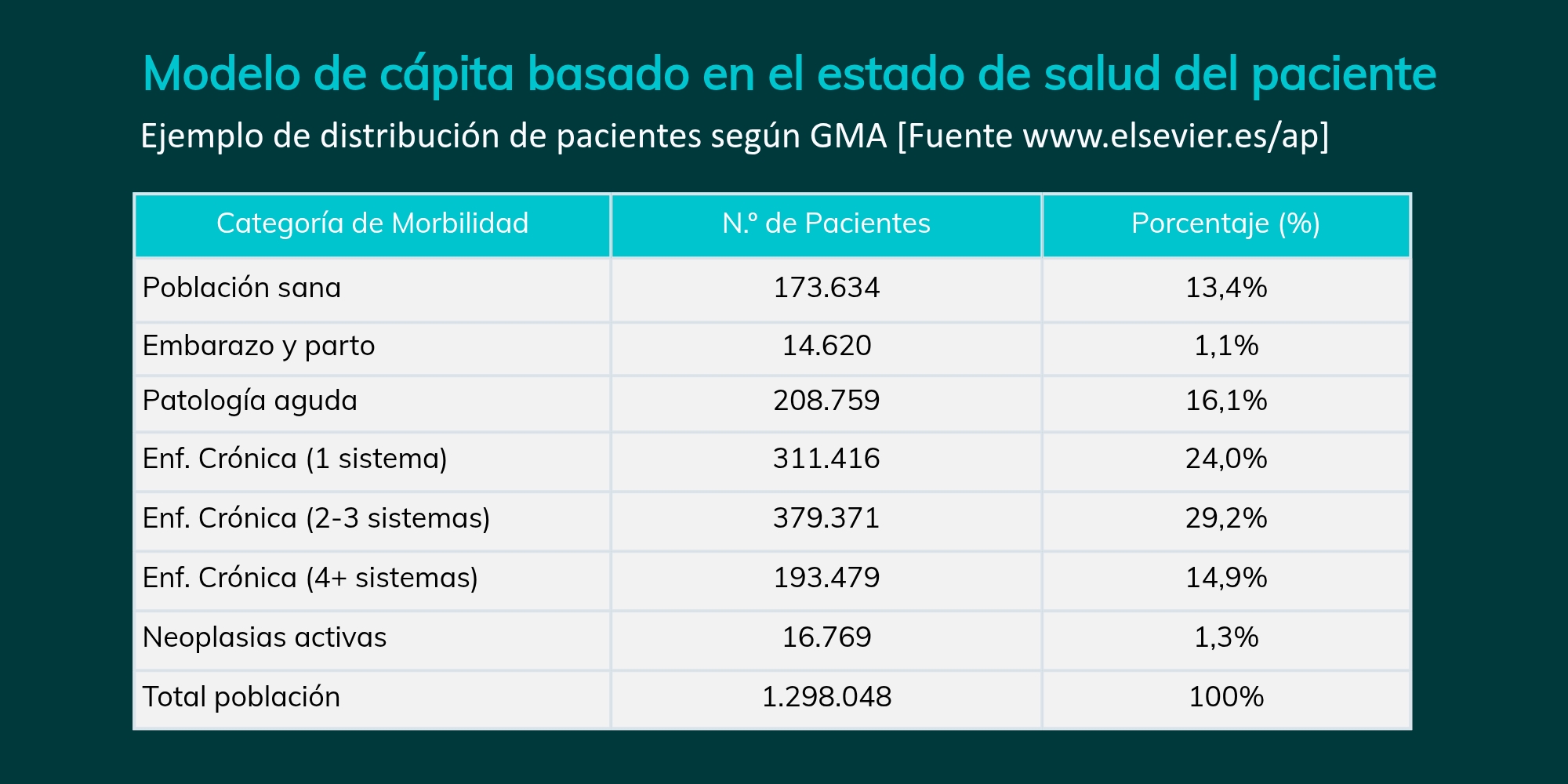 Para ilustrar la relevancia de este parámetro en el cálculo de los ajustes de cápita, presentamos un ejemplo real de distribución poblacional según el modelo GMA: